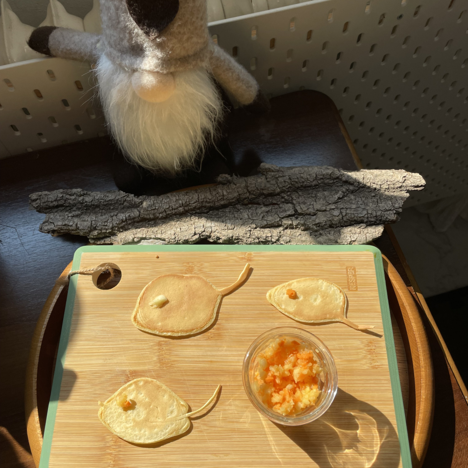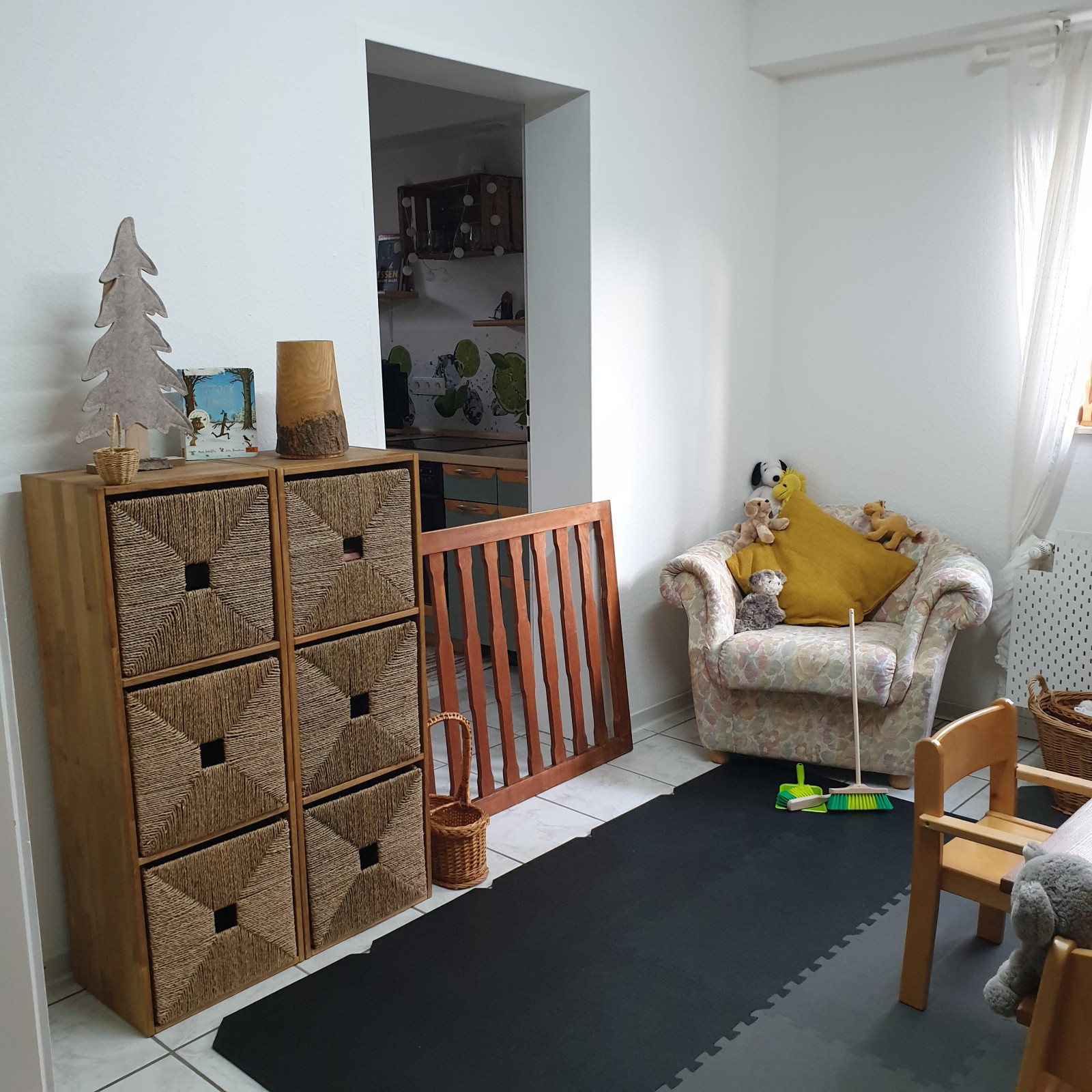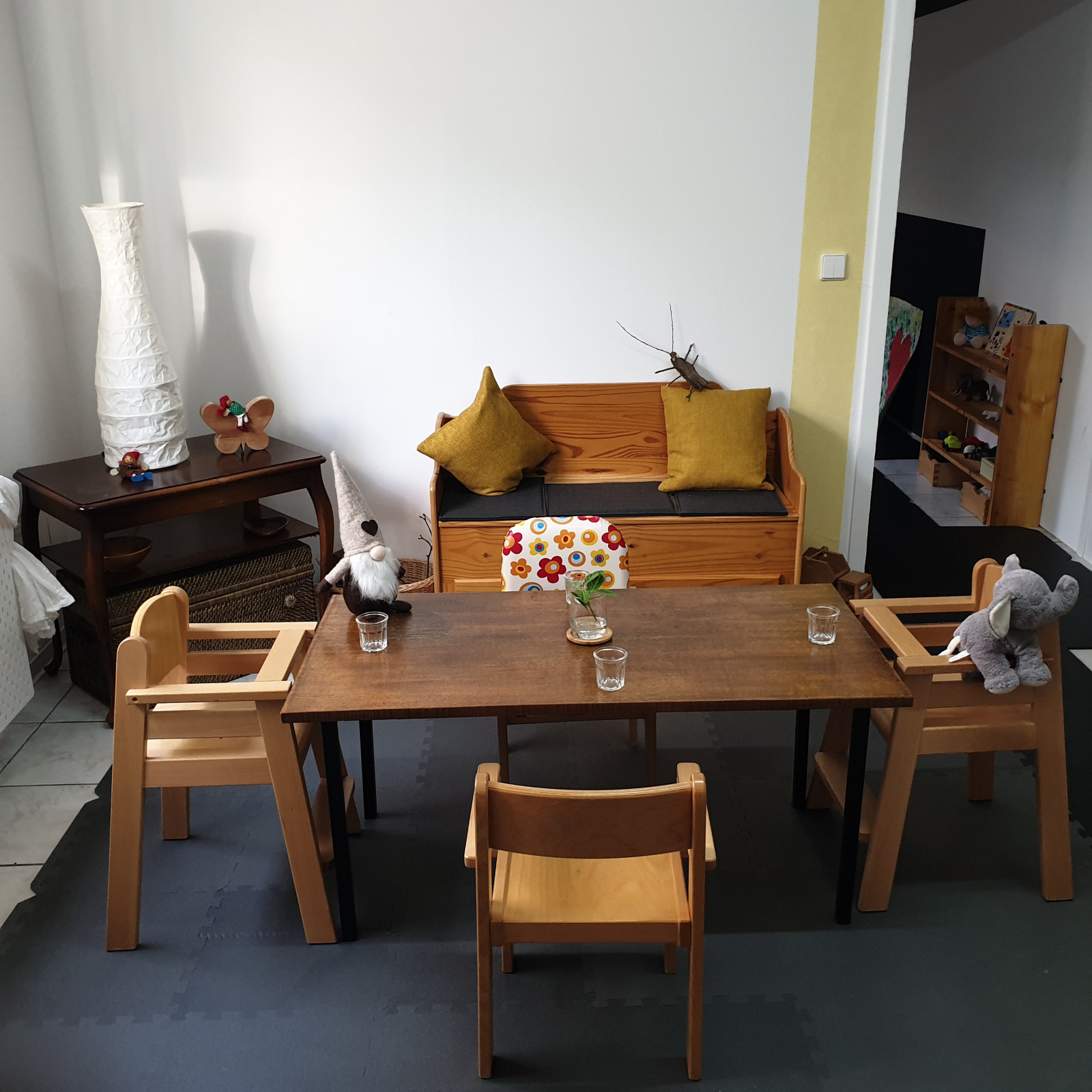Ausgestattet sind die Räume mit verschiedenen Holzmöbeln , alles in kindgerechter Höhe und wenig Spielmaterialien. Spielzeug aus Plastik wird so gut es geht vermieden. Das die Räume mit viel Liebe eingerichtet wurden, spürt man sofort.